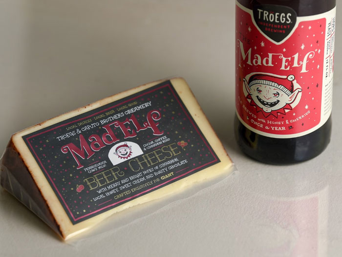 CARLISLE, Pa. – In anticipation of the holiday season, The GIANT Company, Caputo Brothers Creamery of Spring Grove, Pa. and Tröegs Independent Brewing of Hershey, Pa. are teaming up once again on a limited edition cheese offering – Mad Elf Beer Cheese. This merry and bright holiday treat is the third collaboration for the three companies, following the successful launches of Troegenator Beer Cheese last year and Perpetual Beer Cheese earlier this year. As in the other two limited edition cheeses, 100% of the milk used to make Mad Elf Beer Cheese comes from Pennsylvania dairy farms.