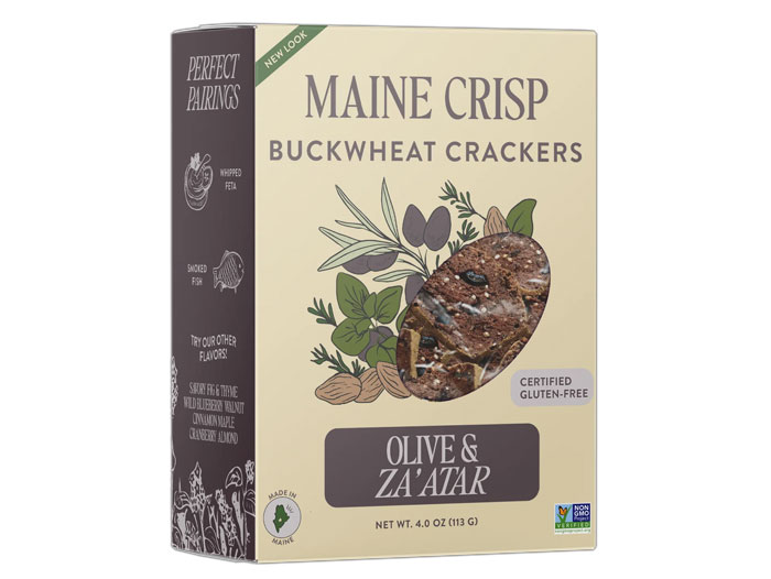 The Maine Crisp product line now comprises five flavors, featuring both locally-sourced and globally-inspired ingredients. Through these delicious, wholesome combinations, Maine Crisp is bringing buckwheat, a nutritious ancient seed, to the modern consumer. All crisps are baked with buckwheat, which is naturally gluten-free, grain free, rich in fiber, and offers a complete protein. The Olive & Za’atar crisp also blends balsamic vinegar and organic honey for depth of flavor.