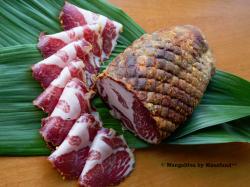- Lonza – Boneless loin, cured with bay leaf, anise, garlic and other spices to create a great herbaceous flavor. It has a luscious Mangalitsa fat cap and is well marbled. Sliced very thin like prosciutto, this is a unique product.