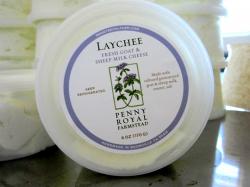 Laychee – meaning milk in Boontling, the all-but-extinct local tongue – resembles the rindless, creamy chevre that many American cheesemakers produce and pack in tubs. But Pennyroyal Farm has 26 sheep in addition to its 99 goats, so from early March to September, Laychee is a mixed-milk cheese. The rest of the year, the sheep are not lactating and Laychee is 100 percent goat's milk.