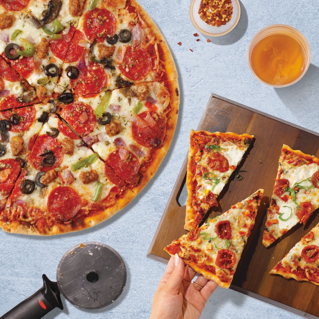 The lineup includes mouth-watering varieties like Italian-Style Supreme Pizza, packed with pepperoni, sausage, green and red bell pepper, mushrooms, and red onion, a classic Margherita Flatbread with a classic combination of fresh mozzarella, roasted cherry tomatoes, and basil, and the debate-inducing Hawaiian Pizza with a sweet and salty combo of sliced Canadian bacon, bacon, and pineapple