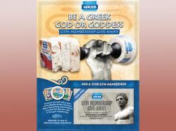 “As we head into the summer months, trends have shown that consumers renew their focus to trim and tone their bodies through diet and exercise,” states Dominique Delugeau, Senior Vice President of Sales at DCI. “Nikos offers a variety of healthy eating options – both as a snack and as part of a well-rounded meal. Through this Greek-themed promotion, Nikos takes it one step further, giving three lucky customers the chance to transform themselves into Hercules with free gym memberships.”