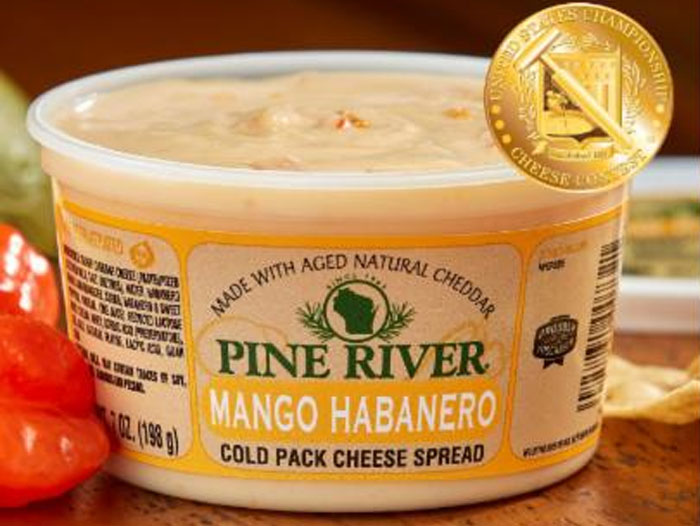 Mango Habanero took first in the Flavored Cold Pack Cheese class with a score of 99.105 out of 100 total points. “This is the first win for Mango Habanero and we’re so excited it’s been recognized,” said Mary Lindemann, Marketing Director of Pine River. “This spread combines spicy habanero peppers with sweet mango and is then blended with our expertly aged Wisconsin Sharp Cheddar for a perfect addition to your cheese board.”