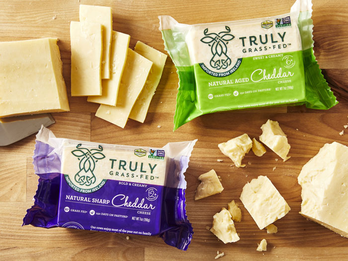All Truly Grass Fed products are sourced from cows that are 95% grass-fed (average of one cow for every two acres), Non-GMO Project Verified, Animal Welfare Approved by A Greener World and free from growth hormones and antibiotics. The resulting dairy products are naturally creamy and rich in nutrients. Truly Grass Fed’s full product line-up includes salted and unsalted butter sticks, ghee clarified butter, a spreadable butter tub as well as hand-cut slices of its natural aged and sharp cheddar cheeses. Truly Grass Fed Natural Aged Cheddar is aged for six months to a smooth and creamy consistency. Truly Grass Fed Natural Sharp Cheddar is aged for 12 months, giving it a distinctive, bold taste. Both are available in seven ounce wedges.