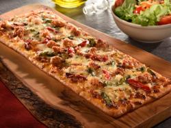 - Tuscan Chicken – A thin, crisp flatbread with a light coating of lemon béchamel sauce and topped with diced chicken breast, garlic, caramelized onion, chopped spinach, roasted mushrooms, basil, pepper flakes, and a three-cheese blend of provolone, Parmesan and Romano.