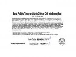 - 24-lb. boxes containing six 4-lb. bags of “Santa Fe Style Turkey and White Chicken Chili with Beans” with lot code 354464-2767.