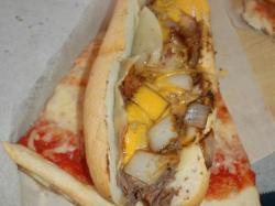 First, you go to Lorenzo's Pizza, and buy a slice of pizza. Then, you rush to Jim's Steaks, a block away. It's important to be fast, so the pizza is still hot when you add the cheesesteak. Also, the exercise of a brisk one-block walk helps work off 1/28th the calories of the first bite you take.