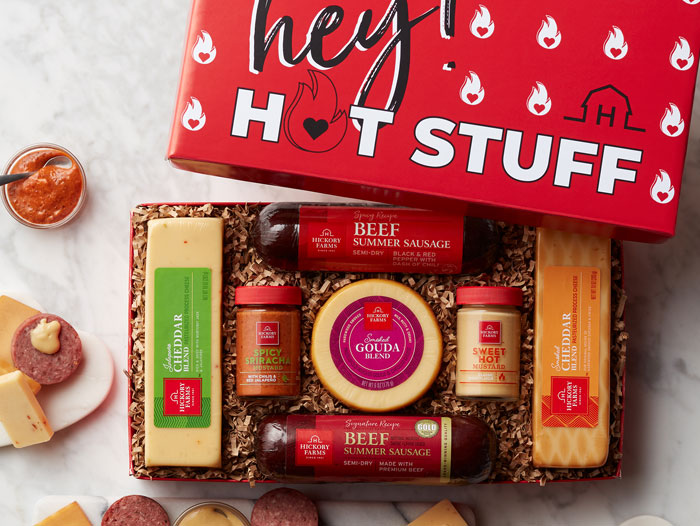 - Hot Stuff Summer Sausage & Cheese Gift Box – Give a spicy twist on our best-selling, most loved gourmet gift! This meat and cheese gift box is perfect for your Valentine who loves snacks with a kick. They can combine our Signature Beef Summer Sausage and Spicy Beef Summer Sausage with a selection of Smoked Gouda Blend, Jalapeño Cheddar Blend, and Smoked Cheddar Blend cheeses. Along with Spicy Sriracha and Sweet Hot Mustards, these tasty bites are ready to dip and delight. The signature designed Valentine’s Day box adds a fun touch to this gift. ($49.99)