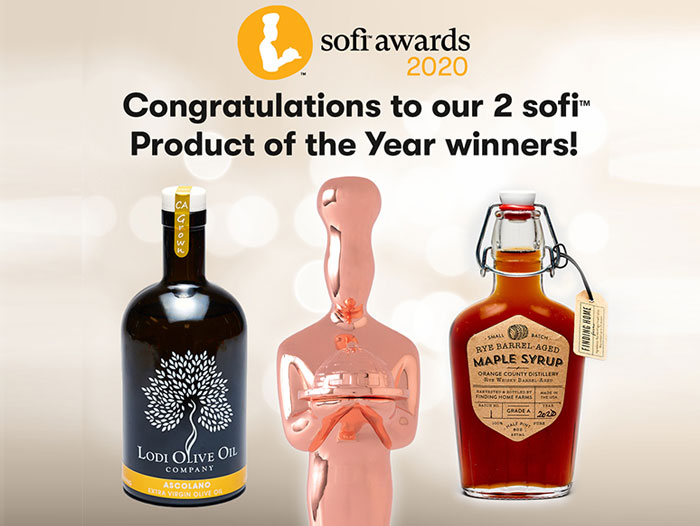 Lodi Olive Oil Ascolano and Rye Barrel-Aged Maple Syrup are the winners of the sofi Product of the Year award, announced Ron Tanner, vice president of education, content & advocacy for the Specialty Food Association, Monday, during Specialty Food Live!