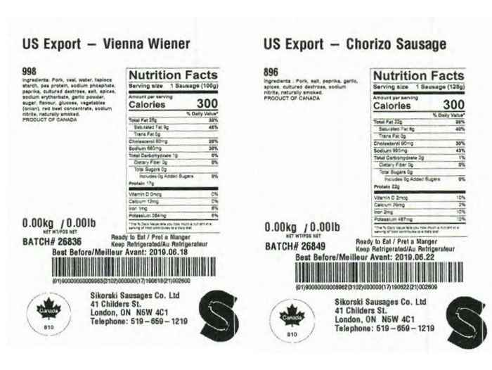 WASHINGTON – Sikorski Sausages Co., Ltd., a London, Ontario, Canada establishment, is recalling approximately 74 pounds of various imported meat and poultry sausage products that were not presented for import re-inspection into the United Sates, the U.S. Department of Agriculture’s Food Safety and Inspection Service (FSIS) announced today.