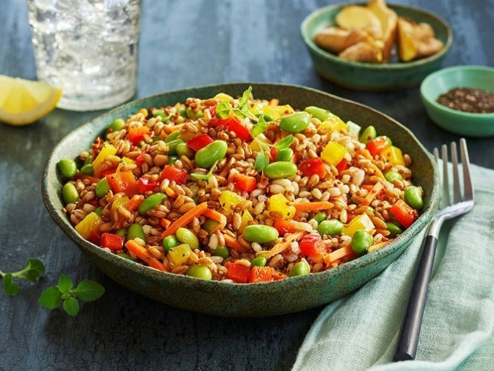 Our 3 Grain Sesame Ginger is a medley of grains beautifully combined with wheat berry, barley, quinoa, and a colorful blend of yellow and red peppers, crisp shredded carrots, edamame, and a light ginger sesame dressing, topped with chia seeds. Perfect for a quick and delicious salad craving.