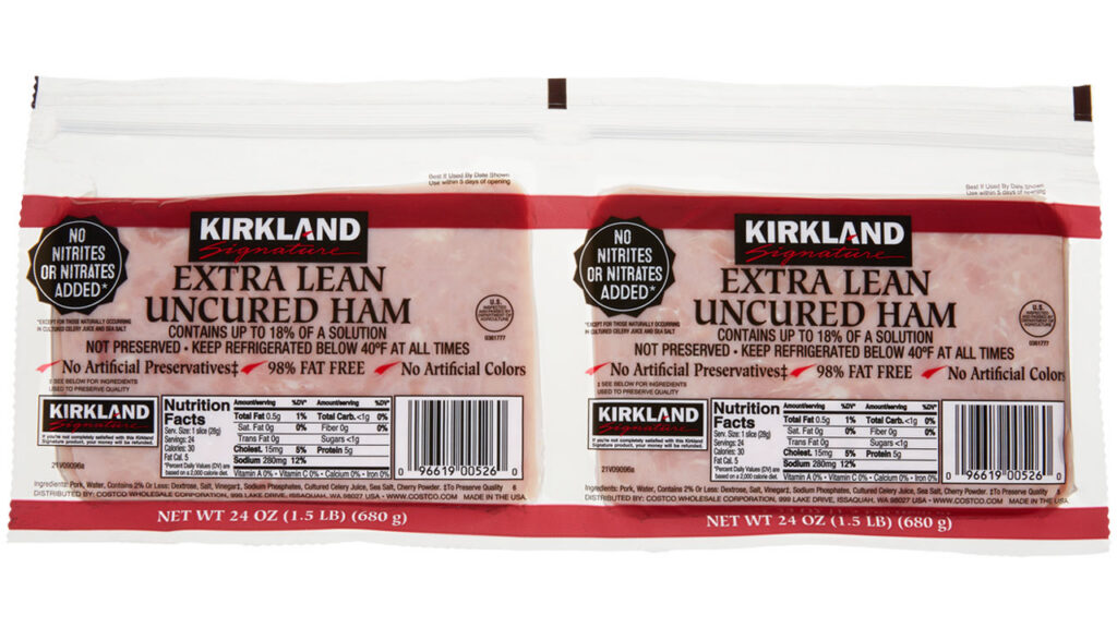 It’s common for deli meat to be high in salt due to the curing process, and while “uncured” ham is still cured, it’s done without the use of synthetic nitrites or nitrates. The Kirkland ham is free from preservatives as well. With that said, the meat still comes in handy for anything from a ham and egg sandwich to a quick, low-effort lunch.