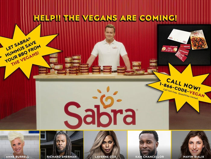WHITE PLAINS, N.Y. — Sabra, maker of America’s favorite hummus, is kicking off the busy summer BBQ season by coming to the rescue of panicked BBQ hosts nationwide. The brand went live with 1-866-Code-Vegan and CodeVegan.com today, offering consumers Rescue Kits filled with vegan BBQ flatbread recipes, product coupons and quirky laptop stickers all designed to remind vegans and omnivores alike that the answer to your summer menu challenge is already in the fridge! Sabra has enlisted the help of hummus-loving celebrities who will spread the word, chime in on the hotline and inspire fans to grab the hummus … because the vegans are coming!