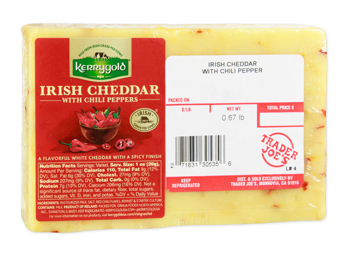 Trader Joe’s recently announced their pick for July’s Spotlight Cheese: the sharp, fiery child of the well-known dairy brand Kerrygold. This unique Irish cheddar is a rich and creamy balance between sharp and spicy, and contains “flakes of fiery red Chili Peppers.” Instagrammer Trader Joe’s List posted a photo of the new product, including the retail price, which at $7.99 per pound is relatively average compared to their other specialty cheeses.