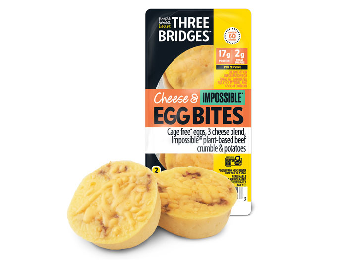 BENICIA, Calif. — Valley Fine Foods, LLC, creators of Three BridgesTM Egg Bites, announced today the release of the first co-branded baked egg bite featuring ImpossibleTM Beef Made from Plants, available in nationwide Kroger stores as well as select Albertsons, Raley’s and Safeway locations. The new Three Bridges Cheese & ImpossibleTM Egg Bites offers vegetarian and flexitarian consumers alike a new way to enjoy a delicious, high-protein breakfast that is ready in 60 seconds.