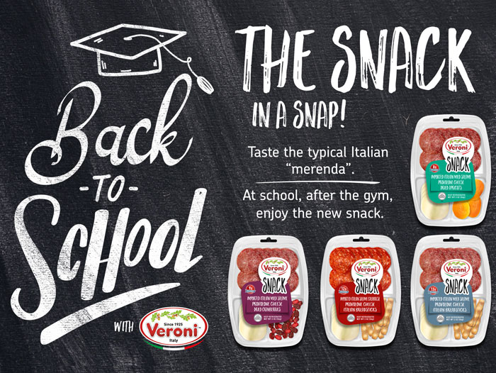 CORREGGIO, Italy — With its snacks full of flavor and protein, Veroni makes ‘back-to-school’ easier, fun, and healthy. The brand-new line of the beloved Italian cured meat maker is inspired by the traditional Italian “merenda”. It comes in four pairing variations that combine Italian salami (mild and spicy), Provolone cheese, breadsticks, and dry fruits such as dried cranberries and dried apricots. The portable snacking trays can be easily packed in lunch boxes for kids, served as an after-school snack, or while on-the-go during after-school activities.