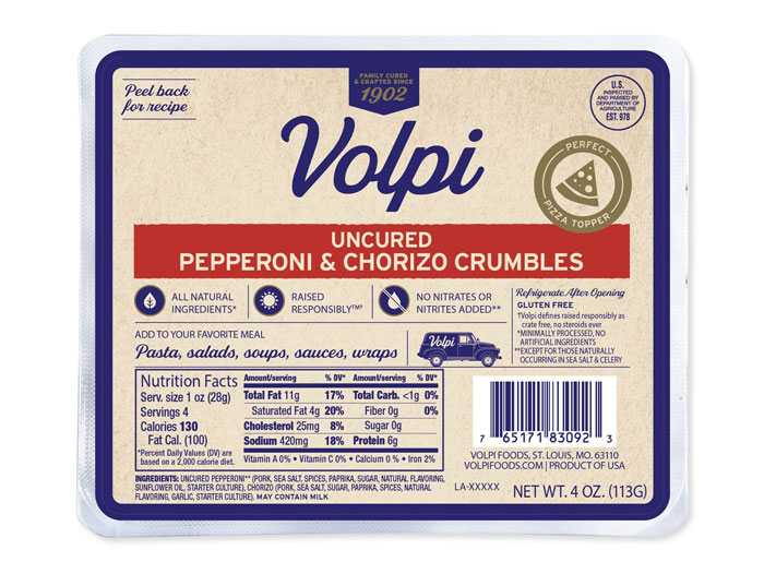 As the most trusted brand of charcuterie, Volpi Foods has a healthy, no-nonsense approach that demands the highest standards. As a result, all of Volpi’s products, including the new Uncured Pepperoni & Chorizo Crumbles, are always all-natural, non-GMO, gluten-free, start with fresh, never frozen, meat — and are made without nitrates.