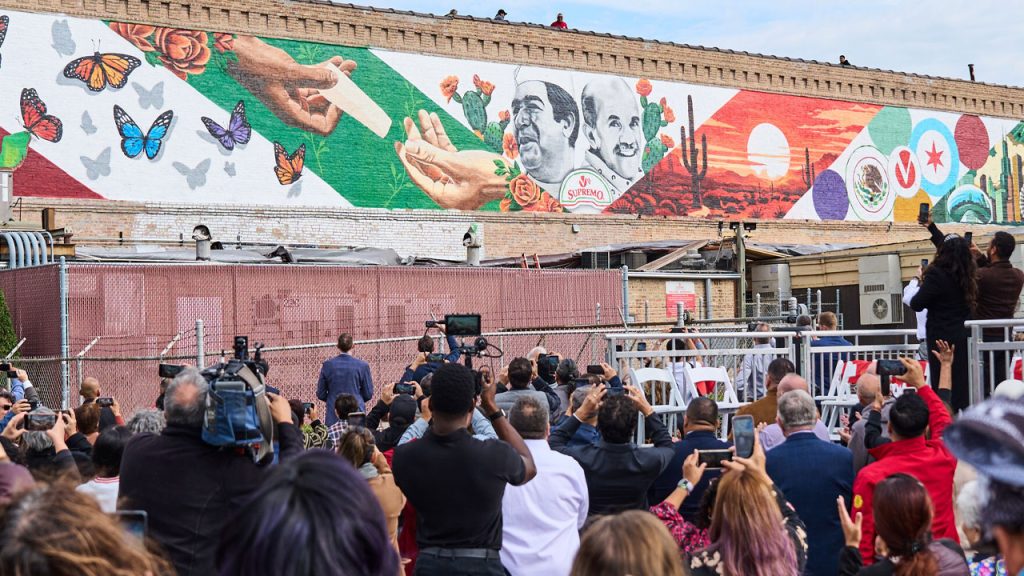 The ceremony was emceed by Univision’s Vicky Aguilar, and featured remarks from Beatriz Ponce de Leon, Deputy Mayor of Immigrant Rights, Alderman Byron Sigcho Lopez, Pilsen community leader Theresa Fraga, and V&V Supremo® Foods’ principals Gilberto and Phillip Villaseñor, followed by a scholarship presentation to Benito Juarez High School. The celebration also included the unveiling of a vibrant mural by artist Everett Reynolds and mural founder Delilah Martinez, as well as the official street naming ribbon-cutting.
