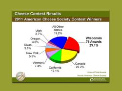 MADISON, Wis. – Wisconsin cheesemakers were honored for their expertise at the recent American Cheese Society Competition in Montréal, Québec, capturing 78 ribbons. Of 1,676 total entries (a record number), Wisconsin cheesemakers claimed 23 percent of all awards, winning more than any other state or country for the seventh year in a row. America's Dairyland's 78 awards included a tie for second place in the prestigious Best of Show category, as well as 22 firsts, 24 seconds and 31 third places.