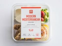 - Modern Mediterranean Snack Box: (Gluten free) grilled chicken, fresh mozzarella, original hummus, cucumbers and tomatoes. A post-workout refuel option that’s high in protein with 36 grams.