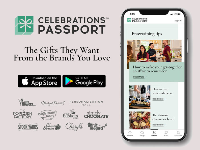 The company’s new Celebrations Passport app features a contemporary and clean design that showcases gifts through lifestyle photography and animated guides that bring products to life for shopping ease. The mobile-first design provides a streamlined customer experience across the company’s portfolio of brands and makes checkout effortless and quick. Access to loyalty program membership details, reminders, unique content, helpful tools, expert advice, and more can now be found in one convenient mobile location. Specially selected product collections for celebratory occasions, including birthdays and anniversaries, as well as product category collections, such as baked goods and gift baskets, make it easy for customers to find the perfect gift. The Celebrations Passport app can be downloaded on a mobile device from the Apple App Store (iPhone) or the Google Play Store (Android).
