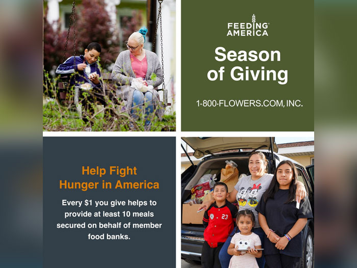 “As we continue to feel the impact of inflation this holiday season, food banks across the nation have reported an increase in the number of people in need of support,” says Lauren Biedron, Vice President of Corporate Partnerships at Feeding America. “Every donation helps us better serve local communities, and we are excited to expand our work with 1-800-FLOWERS.COM, Inc. through their holiday campaign.”