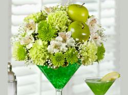 •Apple Martini Bouquet – Make friends green with envy with this truly original floral arrangement. Inspired by the popular Appletini, this arrangement is made up of the freshest green carnations and poms with alstroemeria and fresh greenery. This recipe is accented with straws and green apple picks, sure to shake up any occasion.