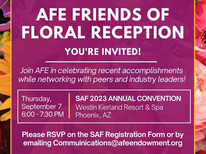 The American Floral Endowment (AFE) announces their upcoming Friends of Floral Reception in Phoenix, Arizona on Thursday, September 7th, from 6:00 – 7:30 pm, in conjunction with the SAF 2023 Annual Convention.