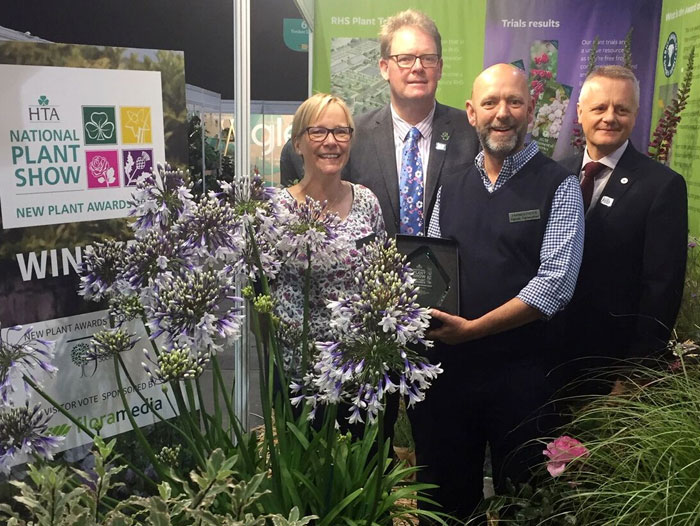 NIn picture Agapanthus Fireworks – National Plant Show 2019 (3) from left to right: Sharon Lowndes (Fairweathers Nursery), Boyd Douglas-Davies (HTA Vice President), Patrick Fairweathers (Fairweathers Nursery), Martin Simmons (HTA Director of Operations).
