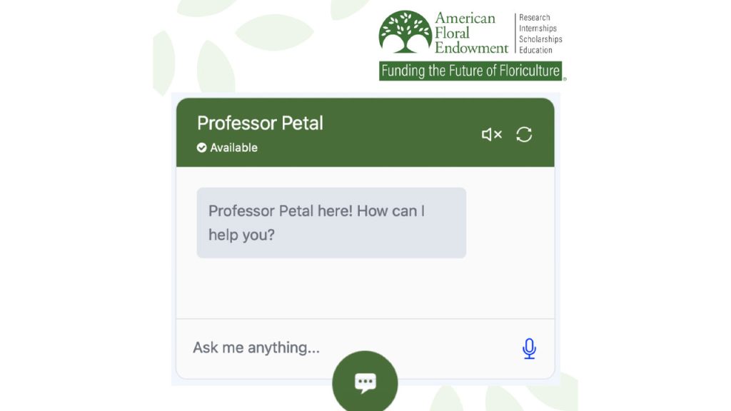 Alexandria, VA — The American Floral Endowment (AFE) has launched a new AI-powered chatbot, Professor Petal, live on www.endowment.org. Developed in partnership with nextvert, an innovative technology company specializing in intelligent automation, Professor Petal is designed to help industry members easily explore and browse our wide range of resources.