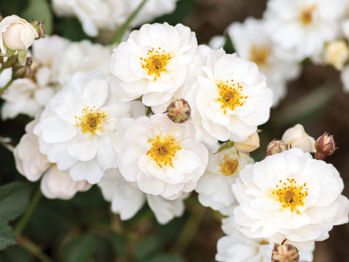 Pretty Polly® White: Pretty Polly® White is a white Polyantha Rose with very good disease resistance and excellent flowering from spring through fall. It maintains a pleasing, compact habit in the landscape and is nearly thornless! The white flowers contrast well with the green foliage.