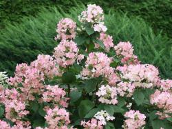 Developed in the Netherlands, ‘Quick Fire’ is one of the earliest paniculatas to bloom each year, usually two weeks ahead of others. This makes it an ideal season extender for cut flower growers, especially those in cooler climates who may not have hydrangea flowers until August. The flowers on this lacecap start white, and turn red as they age. They’re also lightly fragrant, and prime pollinator attractors. A bonus is the dark green foliage with red petioles, making the shrub as pretty as in October as it is fresh in July. Great for bouquets, wreaths, and large-scale designs.