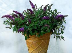 Buddleia ‘Purple Splendor’ PPAF -This robust plant produces fragrant flowers that are borne on large, wide flower clusters. The heavy textured purple flowers with white eyes and yellow centers produce waves of spectacular blooms during the summer heat. ‘Purple Splendor’ has unique, heavily textured, dark green leaves that are egg-shaped with mint-like leaf margins. In the landscape, it reaches 5’ if pruned near ground level in the spring with a tight and dense habit and very sturdy stems and branches. Prefers full sun and regular watering in a well- draining soil. Best of all, it attracts butterflies and hummingbirds. Perfect as a hedge, mass planting, or as a focal plant, perennial garden or cottage gardens. Zone 5-10.