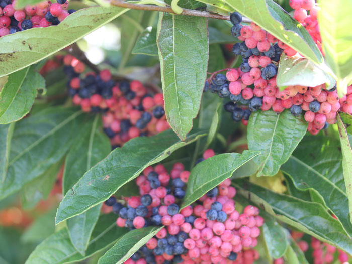One member-grower summarized: “I love the full seasonality of the Brandywine viburnum. I love the pinkish spring flowers, the leaf coloring, and the two-tone berries.”