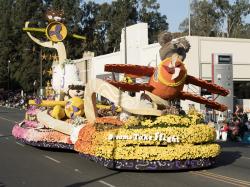 During the recent Decorations Week in Pasadena, the float was adorned with thousands of colorful blooms — including 10,000 roses, 10,000 Gerbera daisies and 1,000 irises. The bulk of the float was festooned with mums: 12,000 chrysanthemums; 7,500 yellow button mums; 3,000 green button mums; 1,000 orange cushion mums; and 500 purple cushion mums.