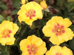 Hulthemias are known for their characteristic red blotch. They typically only bloom once in the spring. The goal of breeders has been to develop roses with the wonderful characteristics of modern roses; re-blooming, pleasing habit, and disease resistance, with the unique red blotch of the Hulthemias.
