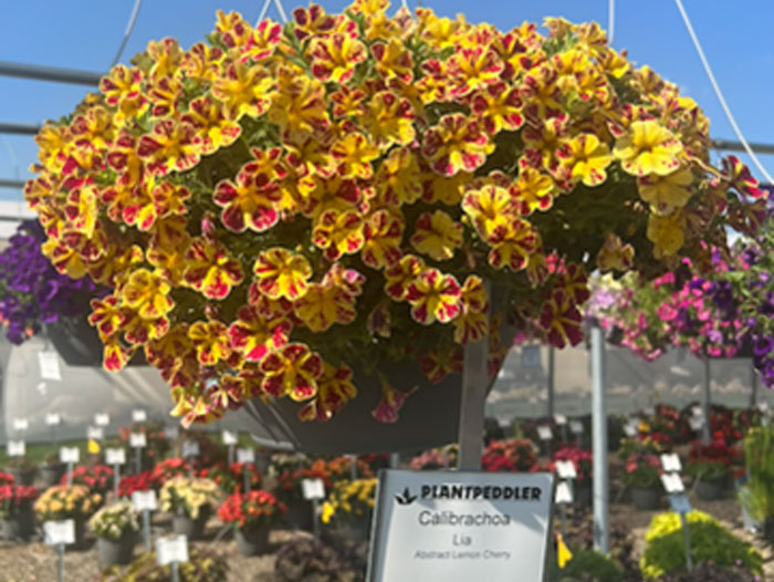 LIAÔ Abstract Lemon Cherry Calibrachoa was a top ten performer at Plantpeddler’s Variety Days in Cresco, Iowa. This bold new introduction is retail ready with loads of brilliant, golden yellow flowers that feature an extra special striking splash of cherry. This medium vigor calibrachoa is the perfect addition to hanging baskets and combinations and is a standout on its own.