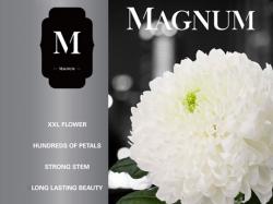 The word ‘magnum’ means ‘big’, and this is exactly why we called this disbudded chrysanthemum Magnum. Its flower is huge: to call Magnum a size XXL is no exaggeration! Not only does its flower get even bigger in the vase as the weeks go by, but it also becomes more spherical. This large eye-catching white flower with bright green at its centre is simply packed with petals. In fact, Magnum has so many ray petals that the flower never opens completely to reveal any disc petals in its centre, even after weeks in the vase. Magnum is an ultra-strong variety that has passed every transport and post-harvest shelf life test with ease – and without any sign of petal damage or loss. These chrysanthemums are delivered in a net – not to prevent any damage but simply to get enough of these large flowers into their box. This unique flower with its high petal count, sturdy stems and beautiful green leaves has already reaped rave reviews. With the introduction of Magnum, Deliflor is taking a new step in chrysanthemums. Magnum will become available in quantities of around 40,000 stems on March, 29th.