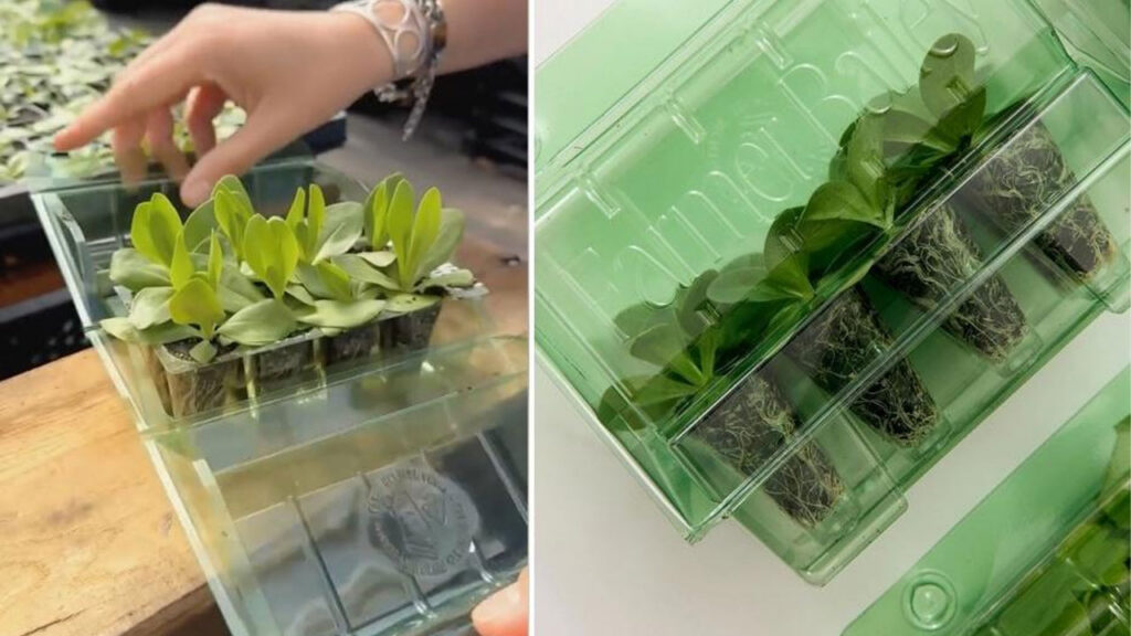 The system begins with specialized grower trays that allow plants to be nurtured from seedling stage. When it’s time to ship, these trays can be easily separated along a perforated line and placed into a mail-order-friendly packaging designed to protect the plants during transit.