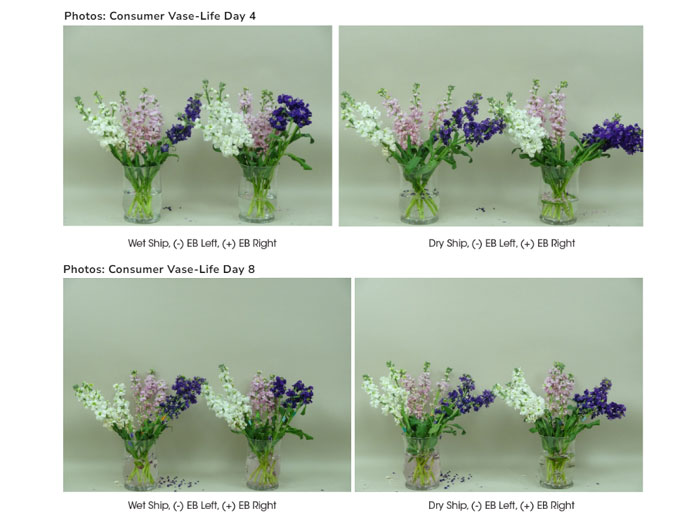 We wanted to investigate the effects of wet versus dry shipping methods and with or without EthylBloc™ treatment on consumer vase-life following simulated wholesale storage and exposure to ethylene gas.