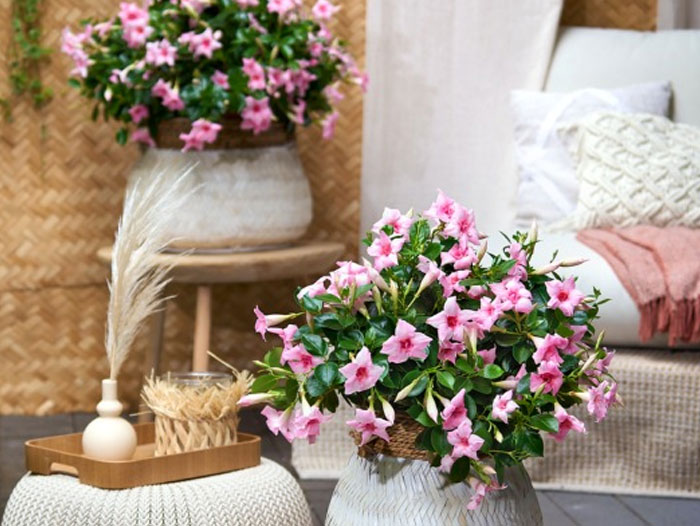 Mandevilla Sundaville® Double Blush Pink can either grow staked as a bushy plant, as a climber on a trellis or hanging from a basket. MNP/Suntory guarantees the typical growing characteristics of the Sundaville® series namely user friendly, suitable for any climate, masses of bright colors and large flowers to name just a few. Consumers will love this sophisticated must-have to add a dash of luxury to the terrace or patio. The first double Mandevilla on the market, a real eye-catcher!
