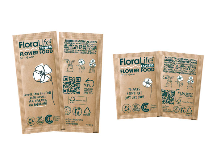 WALTERBORO, S.C. – FloraLife, a division of Smithers-Oasis Company, and worldwide leader in providing solutions throughout the flower journey from propagation to presentation, is announcing that its global line of flower food packets’ carbon footprint has been fully assessed. All FloraLife® branded recyclable paper flower food packet products, which includes FloraLife® Express and FloraLife Crystal Clear®, are now deemed to be carbon neutral. All packaging now conveys this information with symbols to indicate carbon neutrality and end of life recommendations.