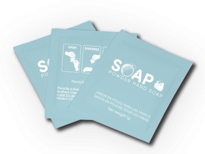 SOAP is available in 3-milliliter liquid and 1-gram powder packets. Both versions are available in 50-pack consumer cartons, 100-pack display boxes and 2,000-pack bulk boxes. The soap packets can be purchased online at FloraLifeCleaners.com and shipped globally or by contacting a FloraLife representative.