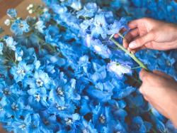 Laura says use the delicate, fluffy and fanciful flowers of the season: garden roses, hydrangea, daffodils, delphinium, forsythia, hellebores, clematis, etc. Also use spring pastel shades of pink and green, blue and yellow, and white and green. These are the flowers that convey the fresh spirit of spring.