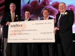 Teleflora and AFE Chairman Tom Butler, along with Teleflora President Jeff Bennett and Executive Vice President Jack Howard presented AFE and incoming AFE Chairman Paul Bachman of Bachman's Inc., with a $1,000,000 check on behalf of Teleflora and owners Stewart and Lynda Resnick.