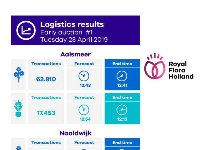 Royal FloraHolland implemented various improvements in the run-up to the 2019 Peak Days. In addition to the purchase of 15,500 extra auction trolleys and the rent of 25,000 CC containers, we also started auctioning plants one hour earlier this year. Given the achieved end times of last Tuesday, the logistic improvements appear to be paying off. The next early auction day is planned for Monday 6 May 2019, in the week before Mother’s Day.