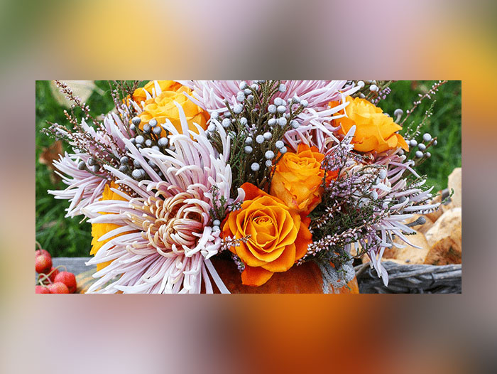 A pumpkin serves as an ideal vase for an autumn floral arrangement filled with vibrant colors and textures. By following step-by-step directions, one can create this stunning display, making it a great opportunity to host a DIY workshop for customers. This not only enhances the customer experience but also fosters a greater appreciation for flowers, while expanding your clientele. Gather essential materials like floral foam, Rio Bi-color Roses, and other fillers to begin.