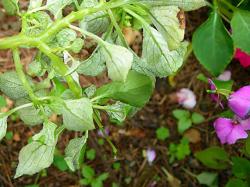 Downy mildew symptoms on Impatiens walleriana typically start with a few leaves that appear slightly chlorotic or stippled, and become completely yellow over time. Some varieties will have subtle gray markings on the upper leaf surface. A white, downy-like growth may be present on the underside of primarily yellow leaves, but can also be found on the underside of green leaves. As the disease progresses, premature leaf drop results in bare, leafless stems. Eventually these stems can become soft and the plant collapses, similar to frost damage.