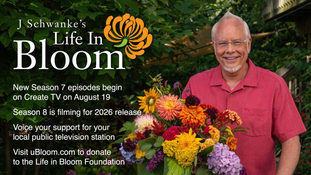 Grand Rapids, MI – “Viewers continue to relax with flowers, enjoying their health and wellness benefits in the process! And I’m beyond excited for them to enjoy the new season as it debuts on Create TV,” enthuses J Schwanke, host and creator. J Schwanke’s Life In Bloom is a flower lifestyle television show seen in the U.S. on public television (PBS) stations nationwide, showing viewers ways to enjoy arranging flowers, and reinforcing the health and wellness benefits flowers offer. The new season will premiere on Create TV Tuesday August 19, 2025, at 6:30 a.m., 8:30 a.m., 2:30 p.m., and Wednesday, August 20 at 4:30 a.m. (all times Eastern – check local listings for details). Free streaming access is available with PBS Passport, the free PBS App – for all devices including smart TV’s – and on PBS.org.