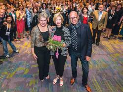 PHOTO?CREDIT: Pictured left to right are Cindy Hanauer, Maxine Burton, and Pieter Landman, surrounded by members of the floral industry at the awards ceremony June 8, 2015. Photo provided by International Floriculture Expo.